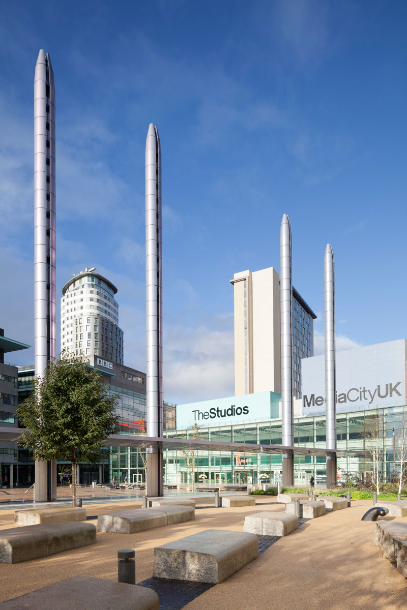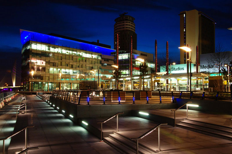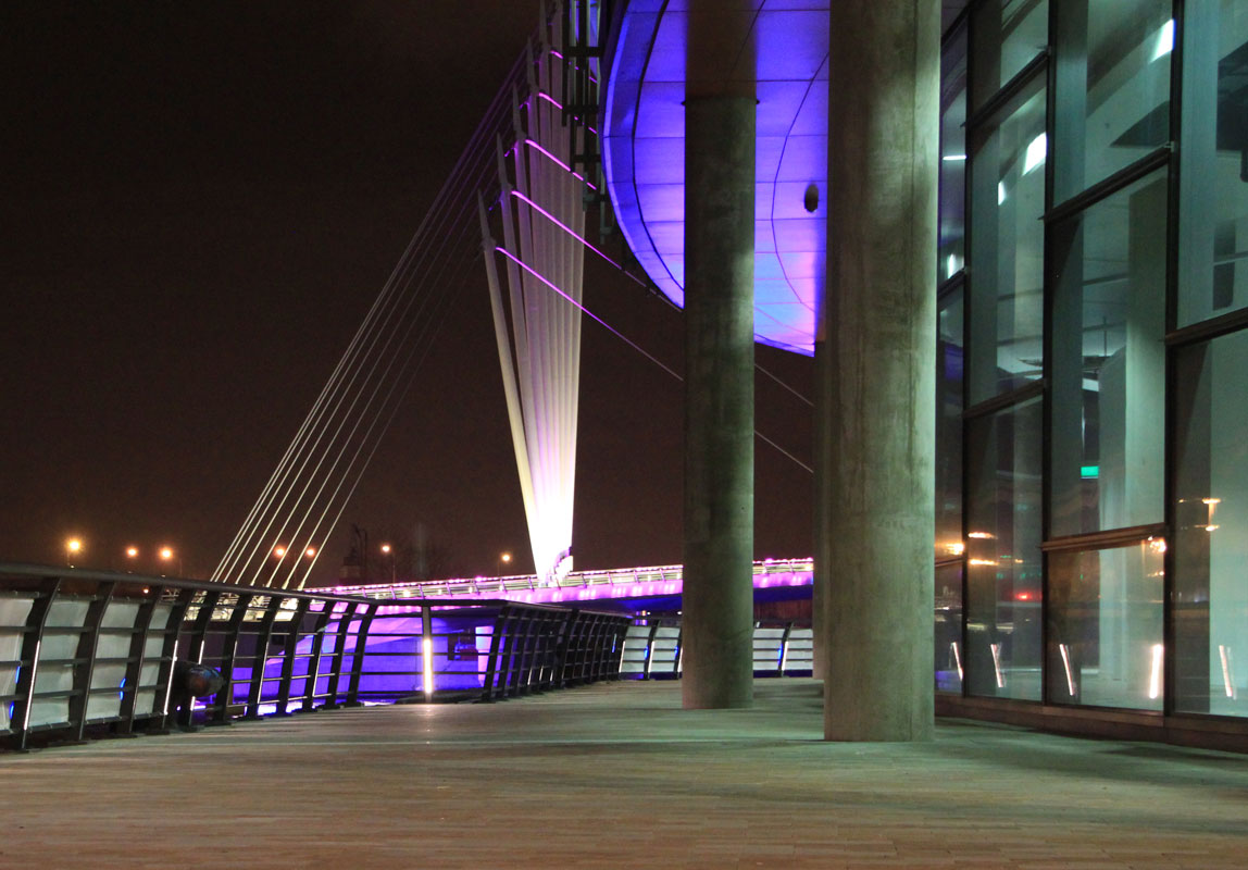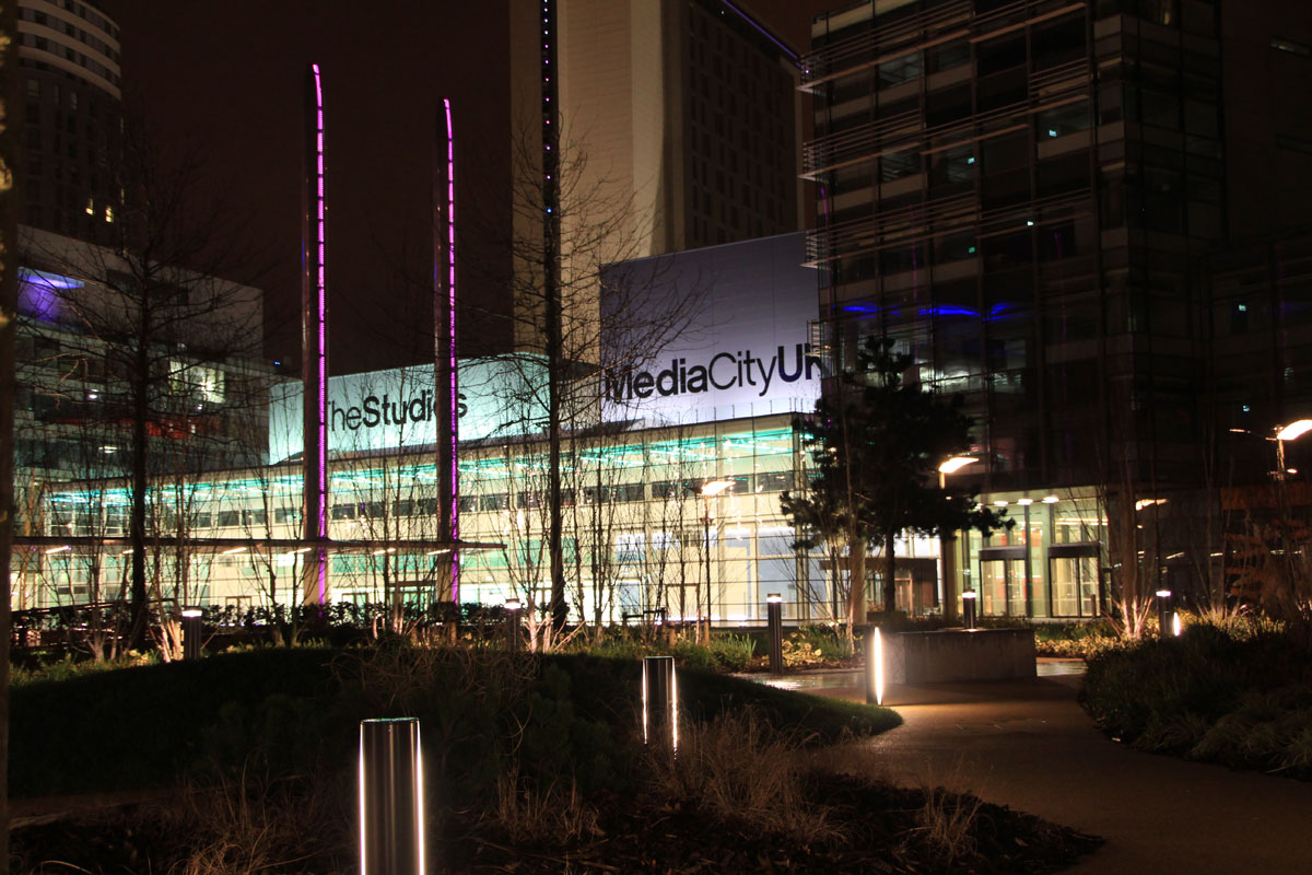 The lighting design for the Media City development was completed by a team comprising of my colleague Chris Sutherland and myself whilst working at lighting design consultants Pinniger and Partners and Studiofractal. Work included lighting masterplanning, designs for bespoke lighting columns, public realm lighting and building facade lighting.